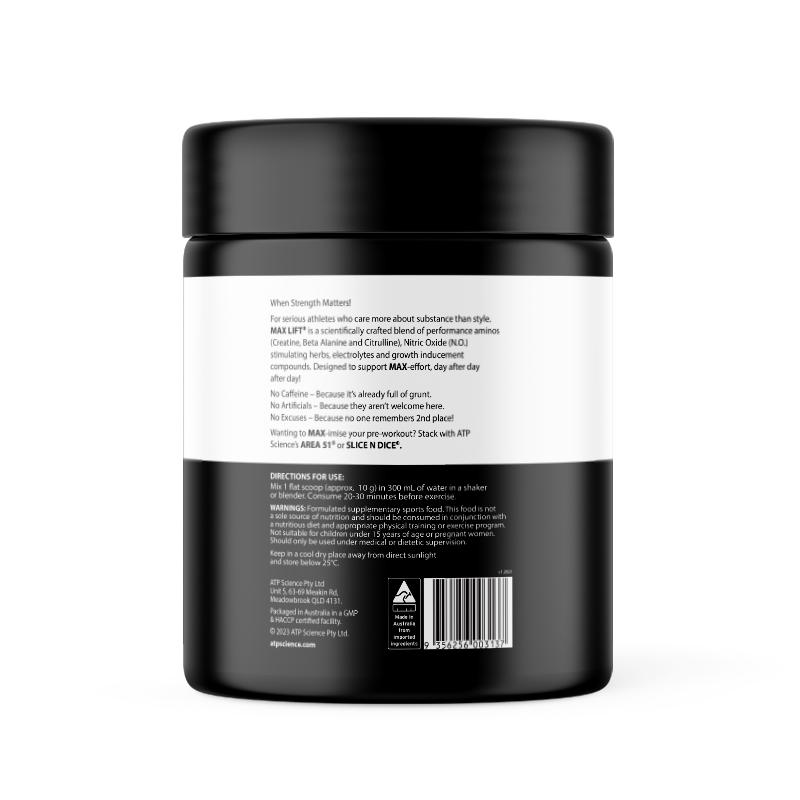 ATP Science Max Lift is designed to support your training routine with a carefully selected blend of ingredients. This convenient powder can be easily mixed with water or your favorite beverage, making it a practical addition to your fitness regimen.