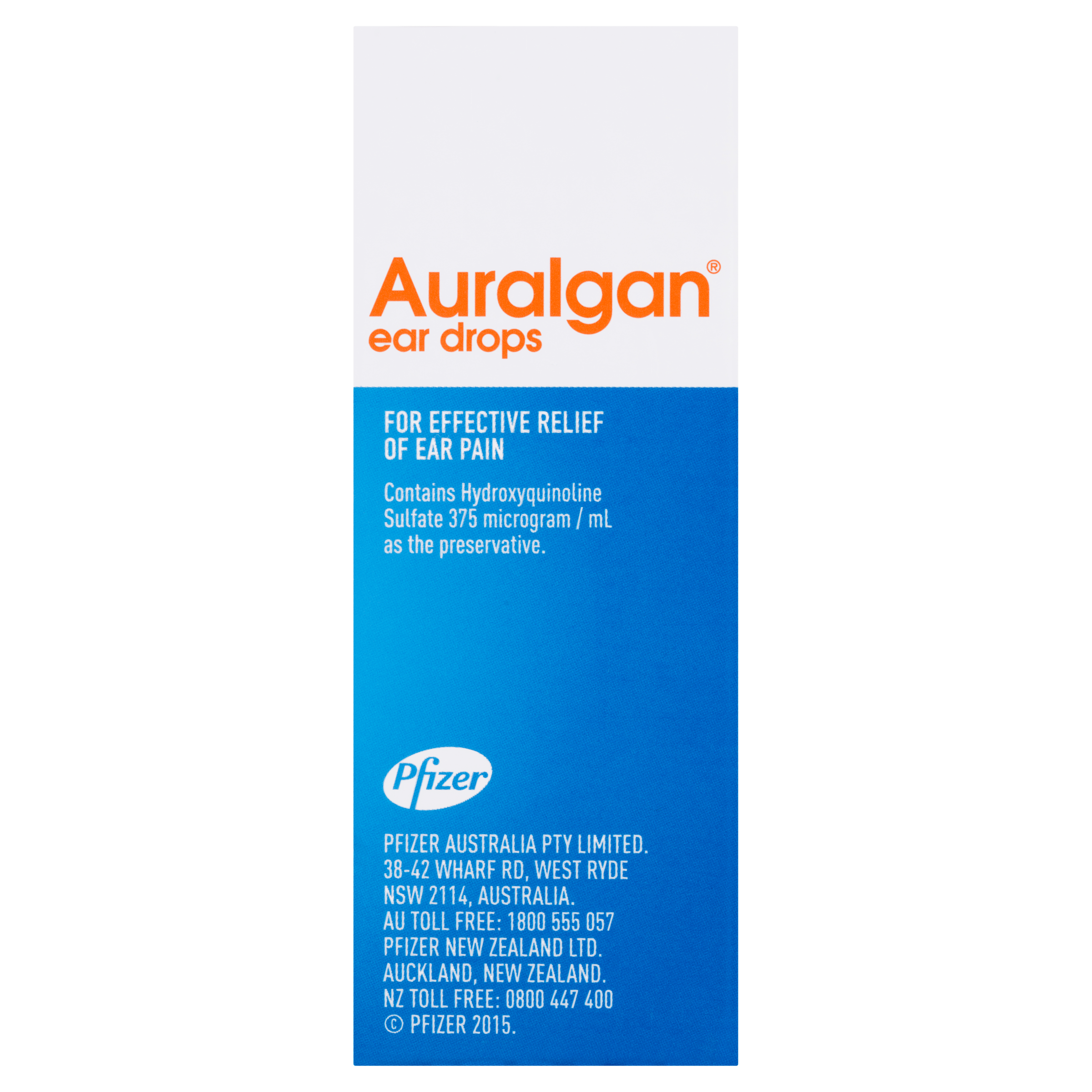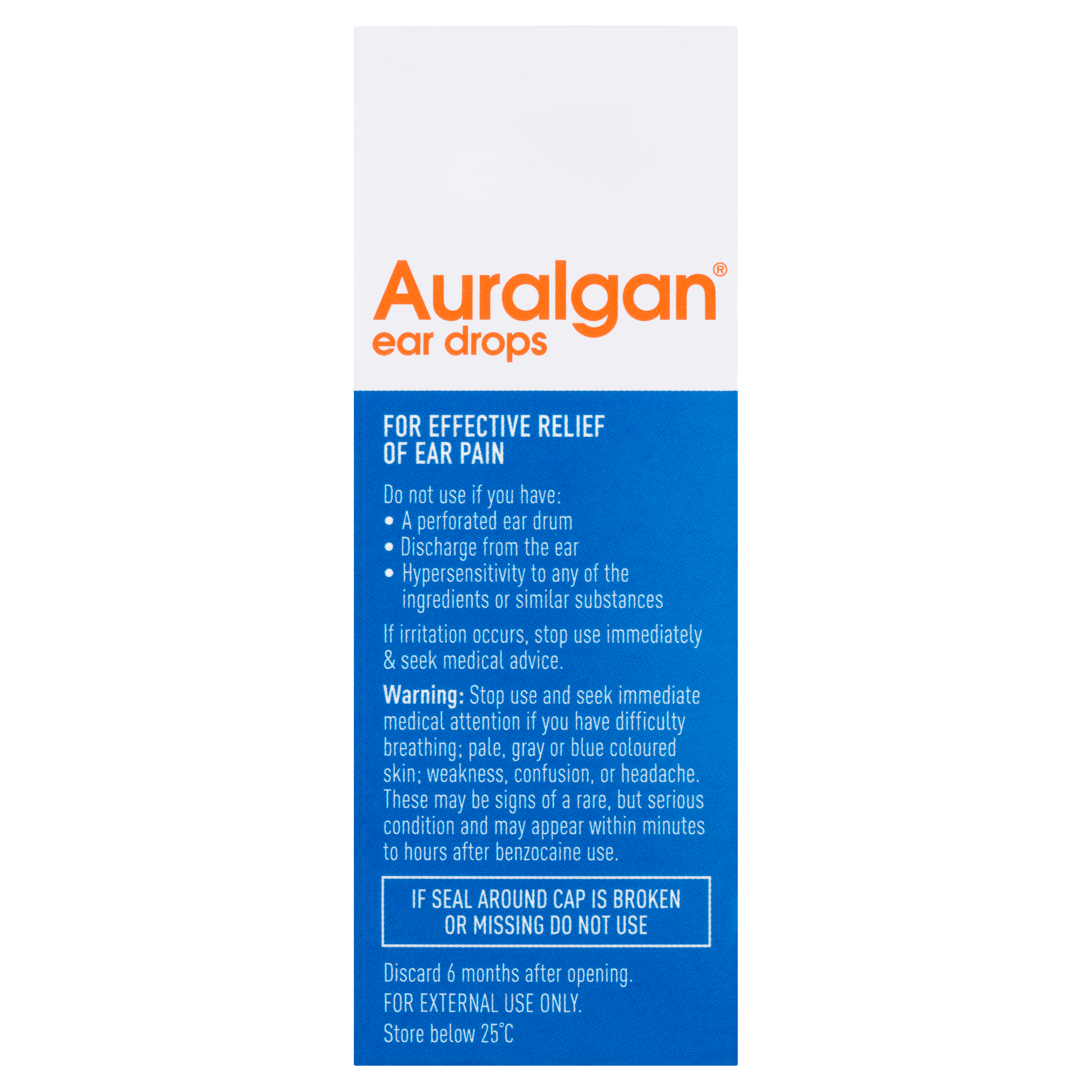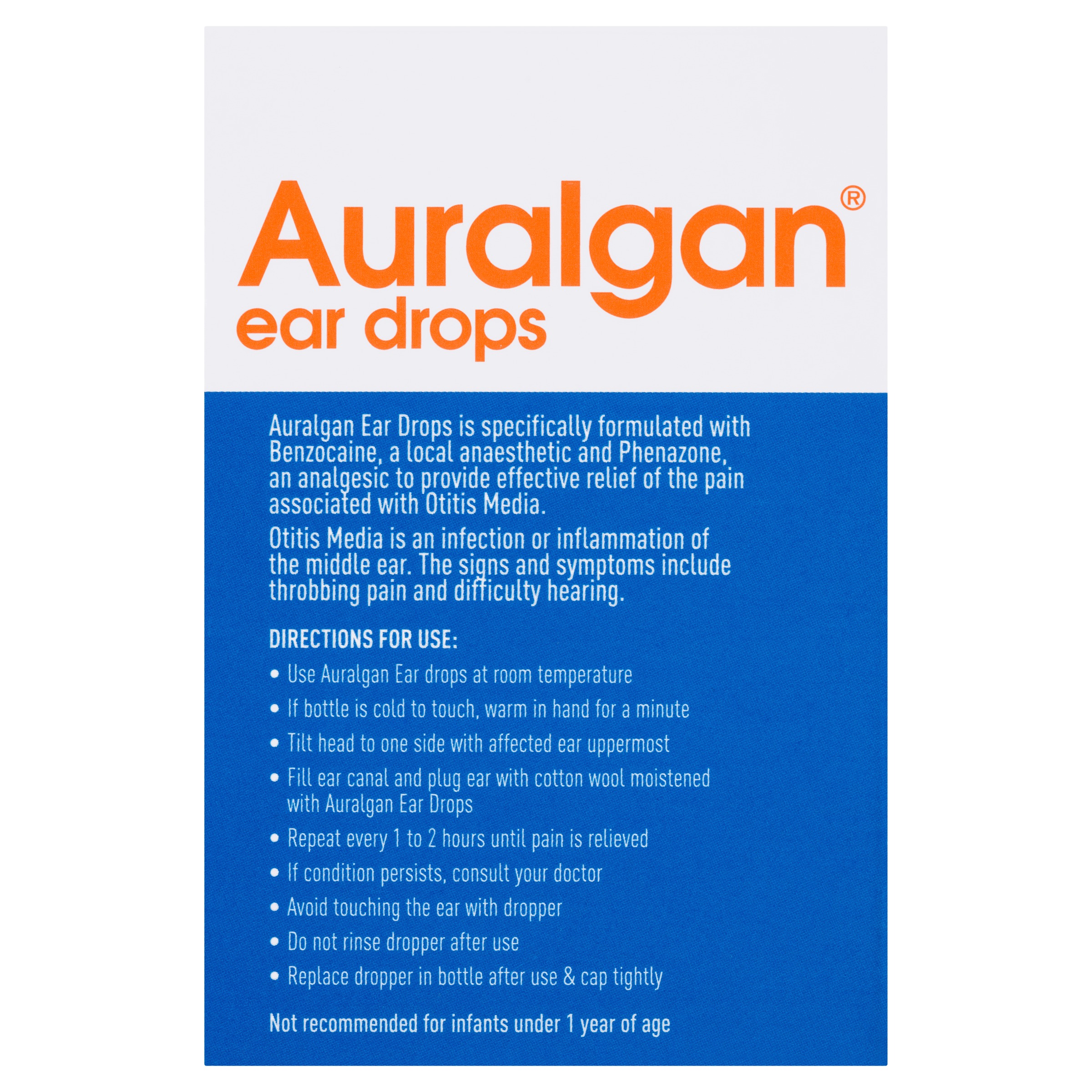 Auralgan Ear Drops is specifically formulated with Benzocaine, a local anaesthetic and Phenazone, an analgesic to provide effective relief of the pain associated with Otitis Media.