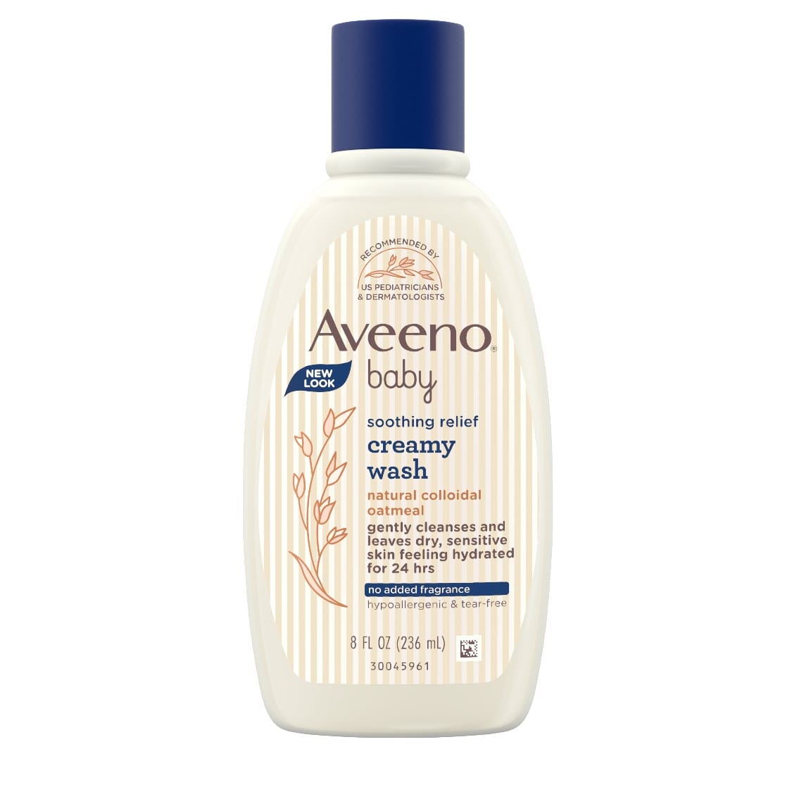 Aveeno Baby Soothing Relief Creamy Wash This tear-free wash is specifically formulated with natural colloidal oatmeal and rich emollients to gently cleanse and soothe dry skin. Hypoallergenic and fragrance-free, it’s gentle enough for every day use on dry, sensitive skin.