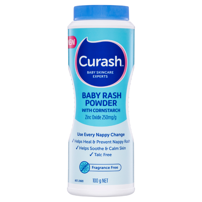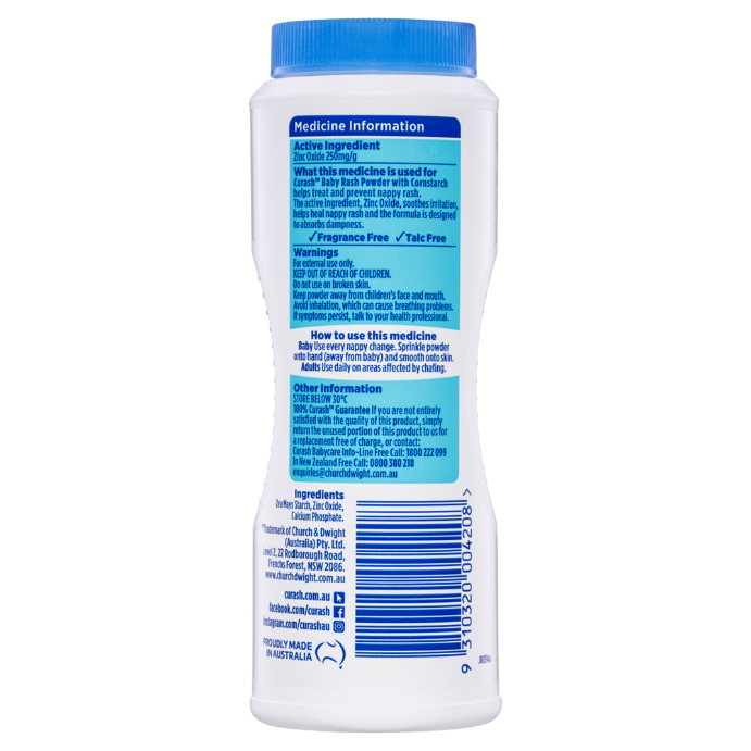 • What it isCurash Baby Rash Powder with cornstarch helps treat and prevent nappy rash. The active ingredient, Zinc Oxide, soothes irritation, helps heal nappy rash and the formula is designed to absorb dampness.