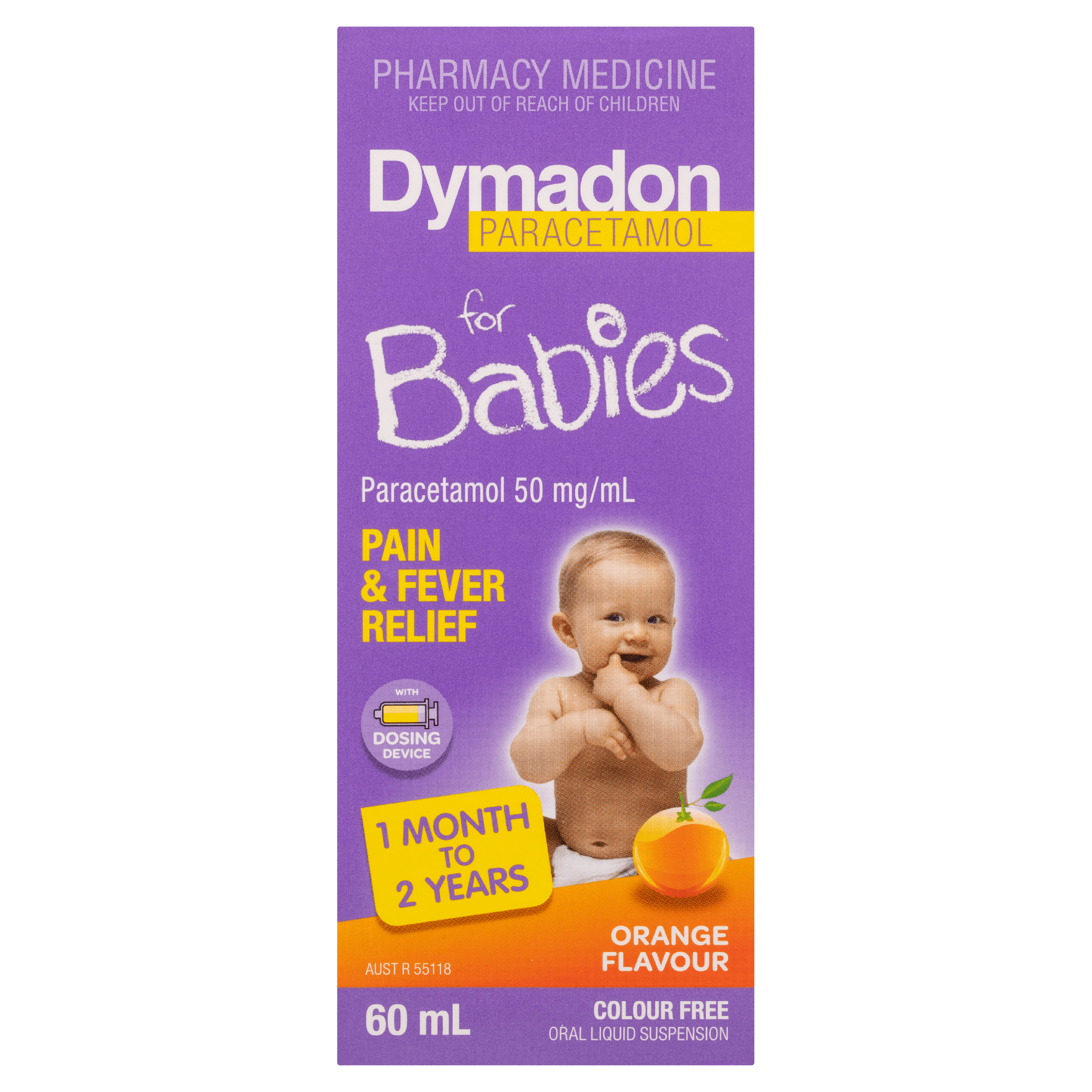 Dymadon for Babies comes in great-tasting orange or strawberry flavour, colour-free oral liquid suspension formulated for babies aged between 1 month and 2 years.