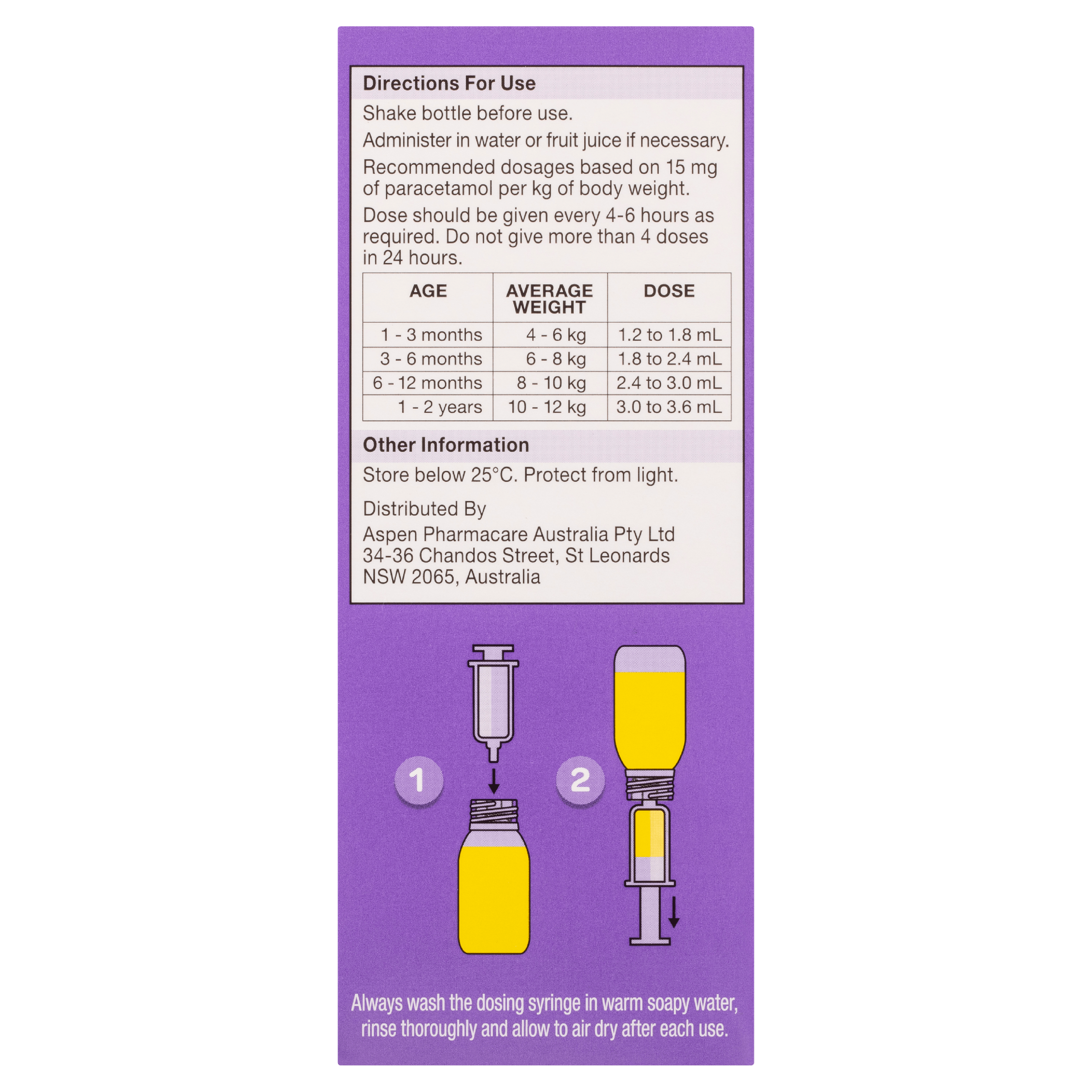 Shake bottle before use. Administer in water or fruit juice if necessary. Recommended dosages based on 15 mg of paracetamol per kg of body weight. Dose should be given every 4-6 hours as required. Do not give more than 4 doses in 24 hours.