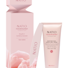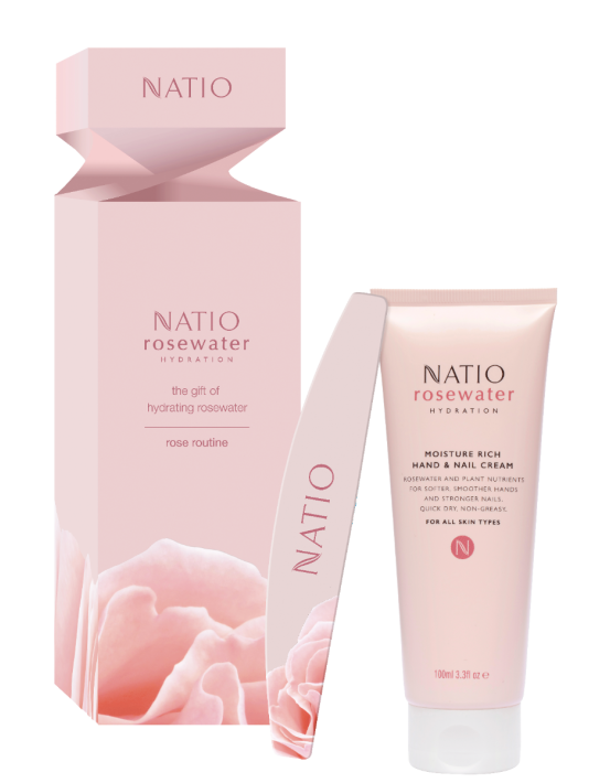 Rose Routine Gift Set contains a full size Rosewater Hydration Moisture Rich Hand & Nail Cream 100ml and Natio 2-in-1 emery board, presented in a Natio gift box.