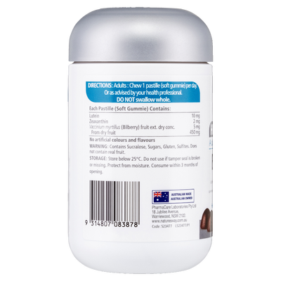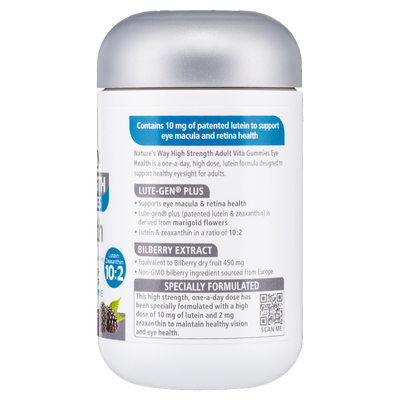 Support your eye health with Nature’s Way High Strength Adult Vita Gummies Eye Health. This high-dose, one-a-day formula contains 10 mg of Lutein and 2 mg of Zeaxanthin in a 10:2 ratio to help maintain healthy eyesight. Enriched with Lute-gen® Plus (patented lutein & zeaxanthin derived from Marigold Flowers) and Bilberry Extract (equivalent to 450 mg of dry fruit), this supplement promotes macula and retina health.