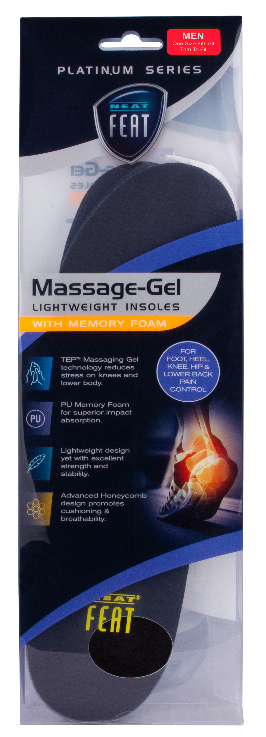 Gel tech; features – massages feet with each step; provides all day long comfort & cushioning; honeycomb design stimulates blood flow; more circulation equals more energy; high shock absorbing ultra gel; helps alleviate heel spur and heel strike pain; distributes your body weight evenly over your feet; relieves stress from your spine, knees, ankles & feet.