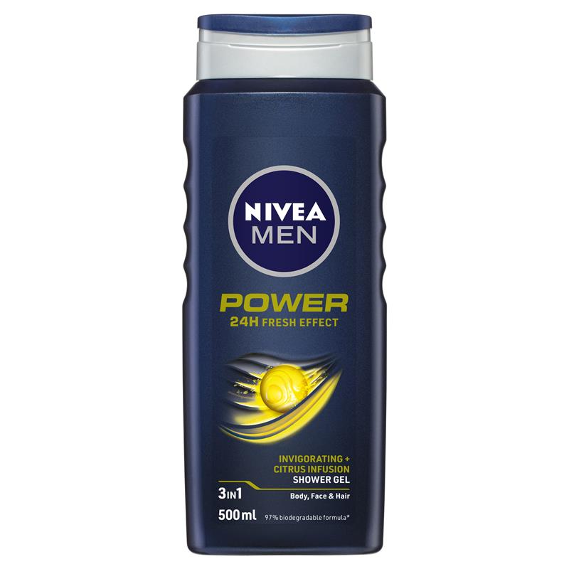NIVEA MEN Power Fresh Shower Gel and Body Wash is perfect for men who want the ultimate extra fresh experience. The energising formula, with its masculine scent, leaves your skin feeling fresh and extra clean. Let this revitalising shower gel and body wash, with 24 hour Fresh Effect, leave your skin and hair feeling at its absolute best. Simply apply the shower gel to your wet skin and massage it onto your body, face and hair before rinsing it off. The formula is 97% biodegradable* Feel refreshed with NIVEA MEN Power. *as per OECD or equivalent methods. Suitable for body, face and hair. Skin compatibility dermatologically approved.