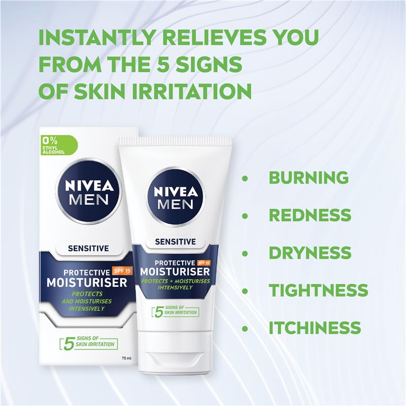 NIVEA MEN Sensitive Face Cream Moisturiser SPF15 with Chamomile & Vitamin E protects your skin against harmful UVA and UVB rays helping to prevent sunburn. The alcohol-free* formula with Chamomile and Vitamin E provides an all day relief from the five most common signs of skin irritation: burning, redness, dryness, tightness and itchiness. The cream is fast-absorbing, non-sticky and non-greasy. Your sensitive skin feels comfortable and smooth, looking healthy and cared for. The skin compatibility of this face care has been dermatologically approved on men with sensitive skin. *no Ethylalcohol.