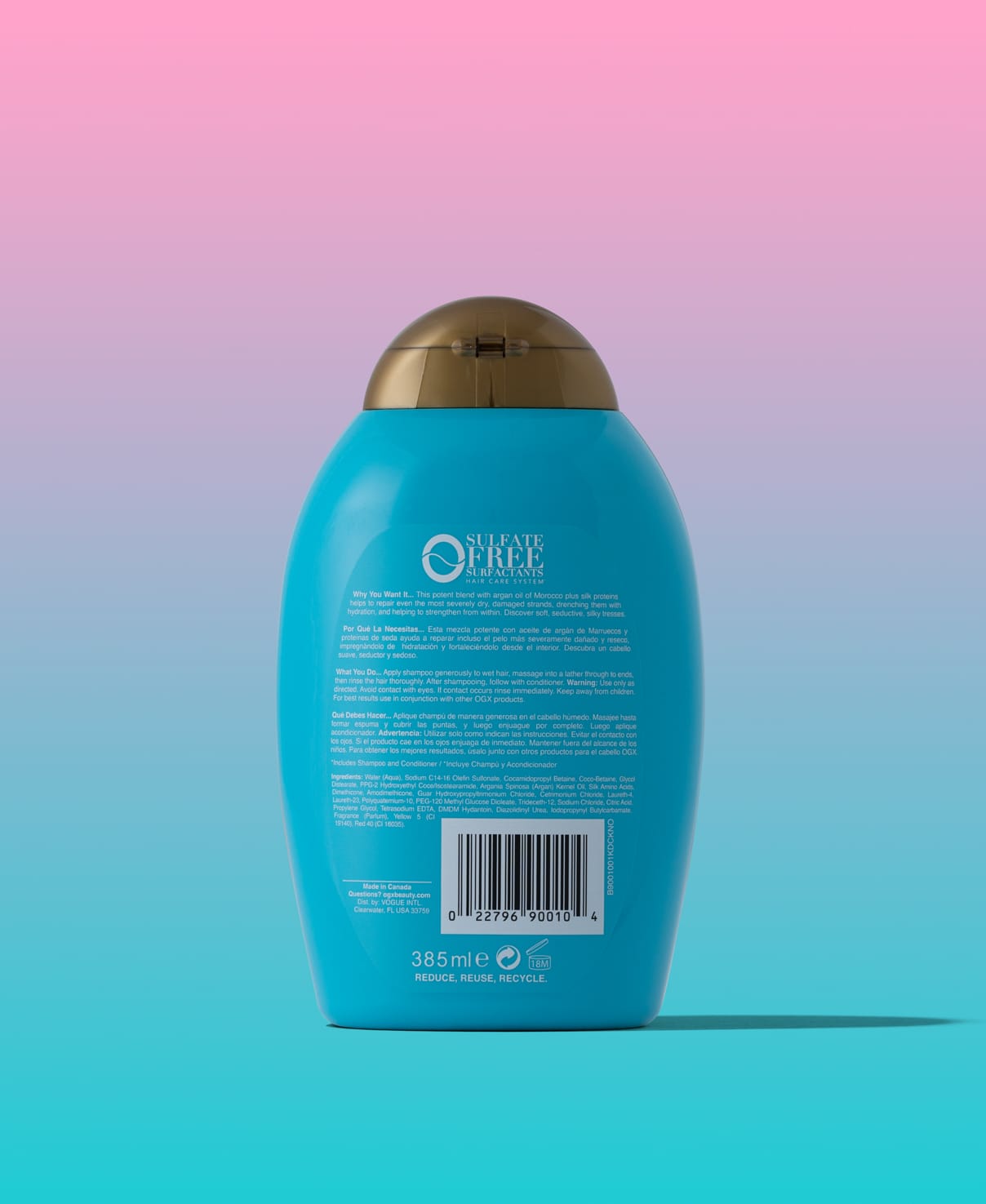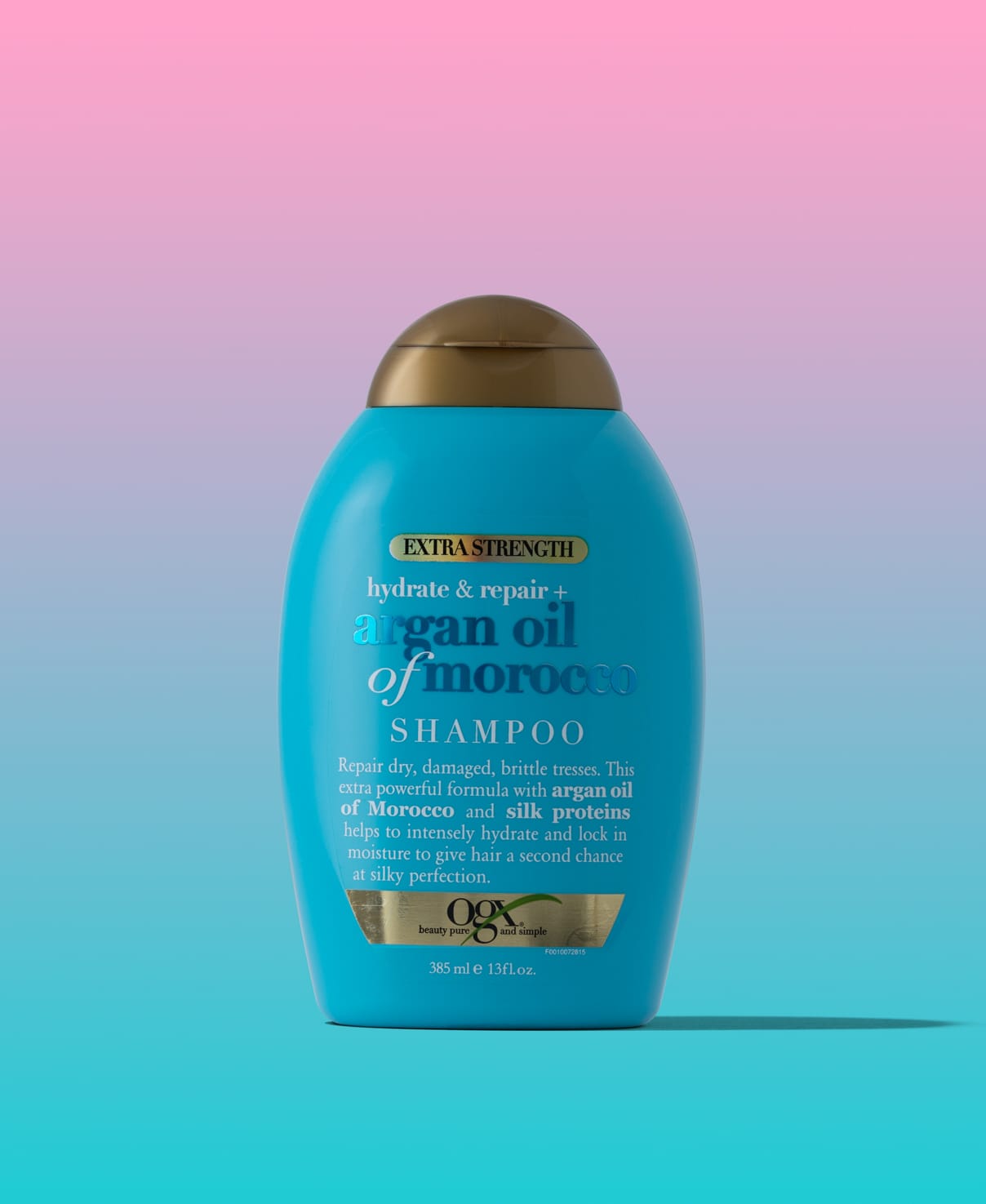 Hydrate, repair, and renew dry, damaged, brittle hair with OGX Extra Strength Hydrate & Repair + Argan Oil of Morocco Hydrating Hair Shampoo. Ideal for medium to coarse hair, the daily moisturizing shampoo quenches each strand as you lather up. Formulated with an extra-hydrating blend of water-based silk proteins and rich cold-pressed Moroccan argan oil, it helps revive hair to leave it cleansed, nourished and silky smooth. The repair shampoo also helps improve hair strength and reduce breakage, leaving you with touchable tresses that are soft but strong. Plus, the coconut milk, tangerine, and warm vanilla scent makes lathering up an all-around sensory experience that leaves locks with an irresistibly good smell. Paraben-free with sulfate-free surfactants, this nourishing shampoo is gentle enough to give locks a radiant shine. For a full hair care routine that’ll leave your hair lush, soft and divinely shiny, pair with OGX Extra Strength Argan Oil of Morocco Conditioner.