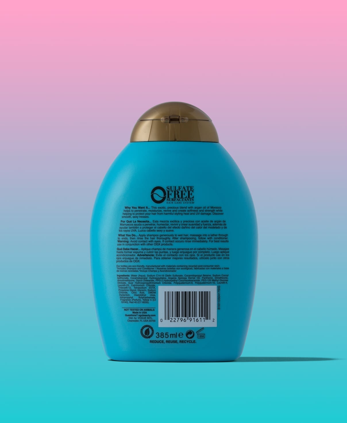 Water (Aqua), Sodium C14-16 Olefin Sulfonate, Cocamidopropyl Betaine, Glycol Distearate, Argania Spinosa Kernel Oil, Sodium Hydrolyzed Potato Starch Dodecenylsuccinate, Polyquaternium-22, Linoleamidopropyl PG-Dimonium Chloride Phosphate, PEG-7 Amodimethicone, Polyquaternium-39, Laureth-4, PEG-150 Pentaerythrityl Tetrastearate, PPG-2 Hydroxyethyl Cocamide, Acrylates/C10-30 Alkyl Acrylate Crosspolymer, Propylene Glycol, Hexylene Glycol, Citric Acid, Sodium Citrate, Sodium Hydroxide, Sodium Benzoate, Fragrance (Parfum), Yellow 5 (CI 19140), Red 40 (CI 16035).
