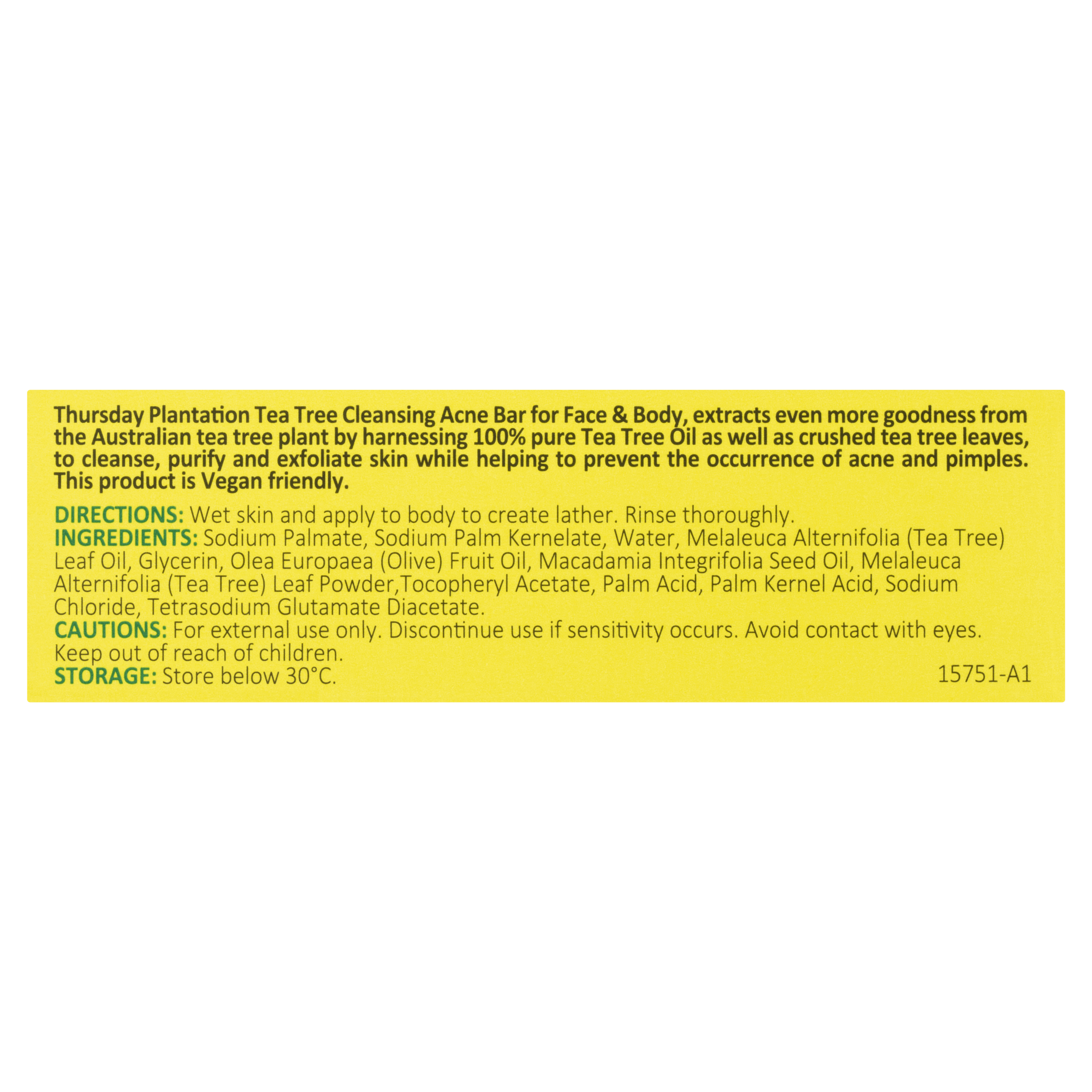 Sodium Palmate, Sodium Palm Kernelate, Water, Melaleuca Alternifolia (Tea Tree) Leaf Oil, Glycerin, Olea Europaea (Olive) Fruit Oil, Macadamia Integrifolia Seed Oil, Melaleuca Alternifolia (Tea Tree) Leaf Powder, Tocopheryl Acetate, Palm Acid, Palm Kernel Acid, Sodium Chloride, Tetrasodium Glutamate Diacetate.